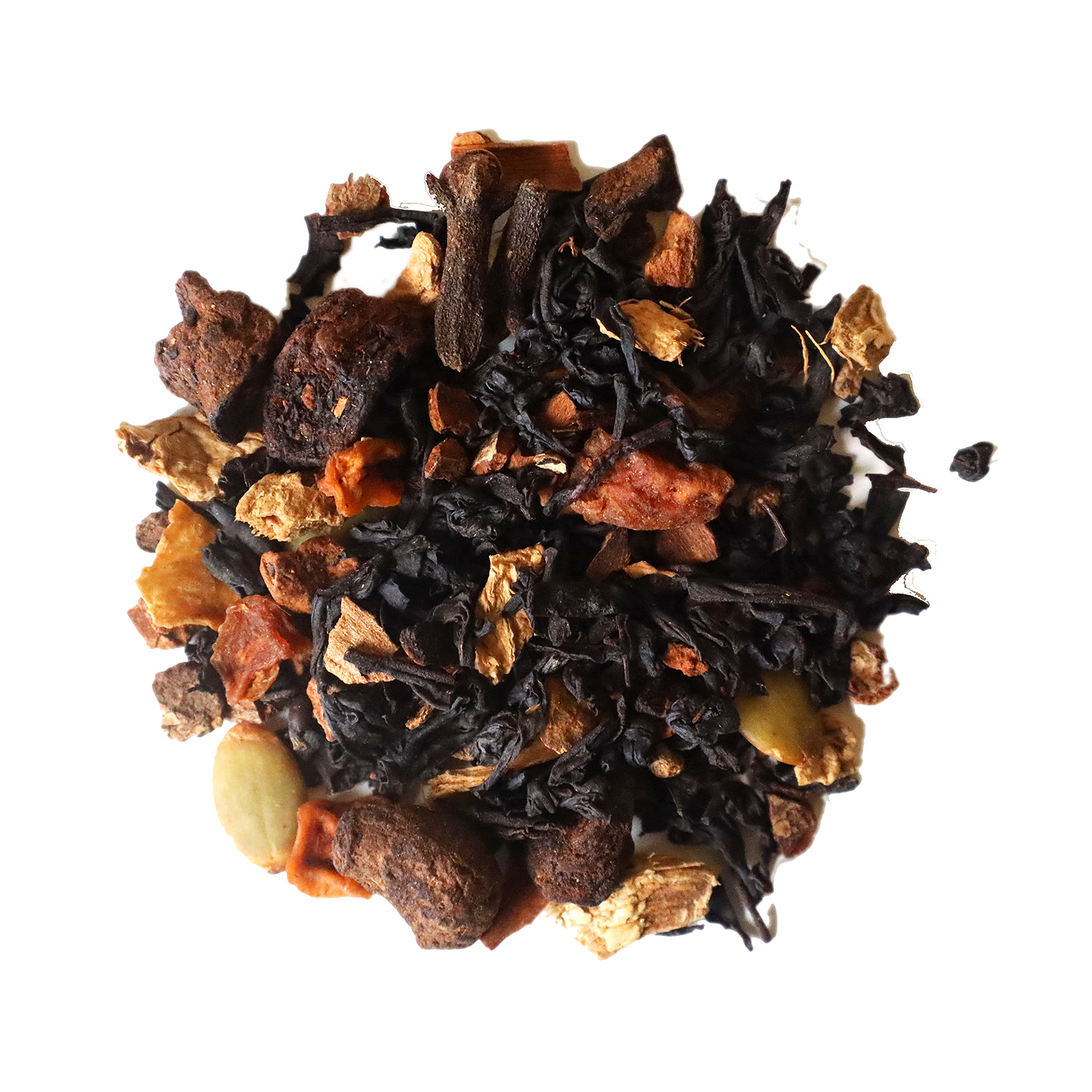 svart te, kanelbitar, ingefära, pumpabitar, pumpafrön, rostad cikoriatrot, kardemumma och kryddnejlika.